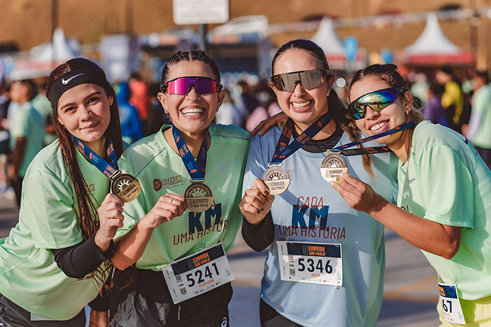 Participantes exibem medalha da Corrida Outlet Premium São Paulo (Outlet Premium São Paulo/Divulgação)
