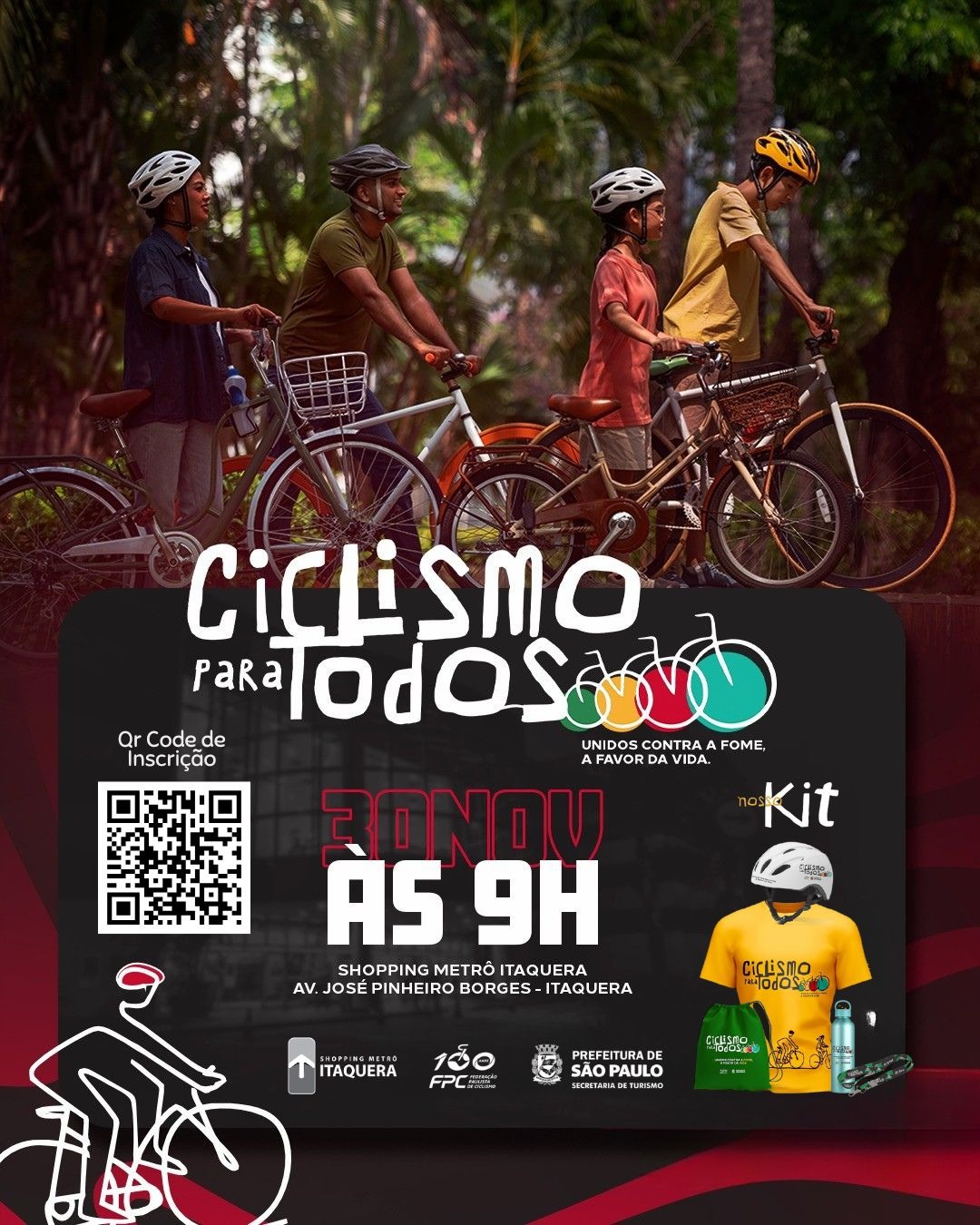 A Federação Paulista de Ciclismo leva um passeio ciclístico gratuito à zona leste de São Paulo às 9h de 30 de novembro de 2025. O Ciclismo para Todos reúne até 5 mil participantes no estacionamento do shopping Metrô Itaquera, onde iniciam percurso de cerca de 7 km pela região.