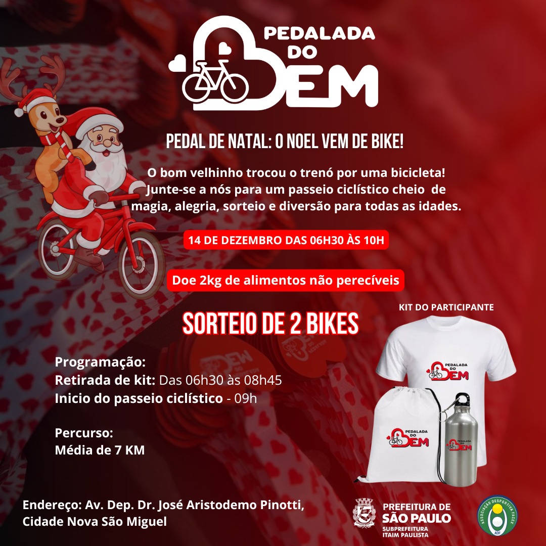 A edição de Natal da Pedalada do Bem é realizada na avenida Deputado Doutor José Aristodemo Pinotti, em São Miguel Paulista, na zona leste de São Paulo, às 9h de 14 de dezembro de 2025. São 7 km de percurso. A Associação Desportiva Facex organiza o evento.