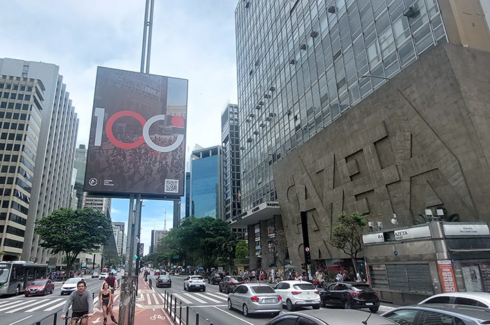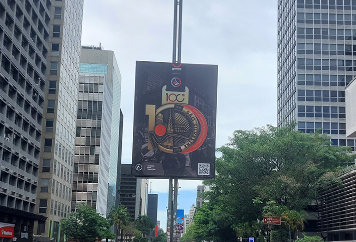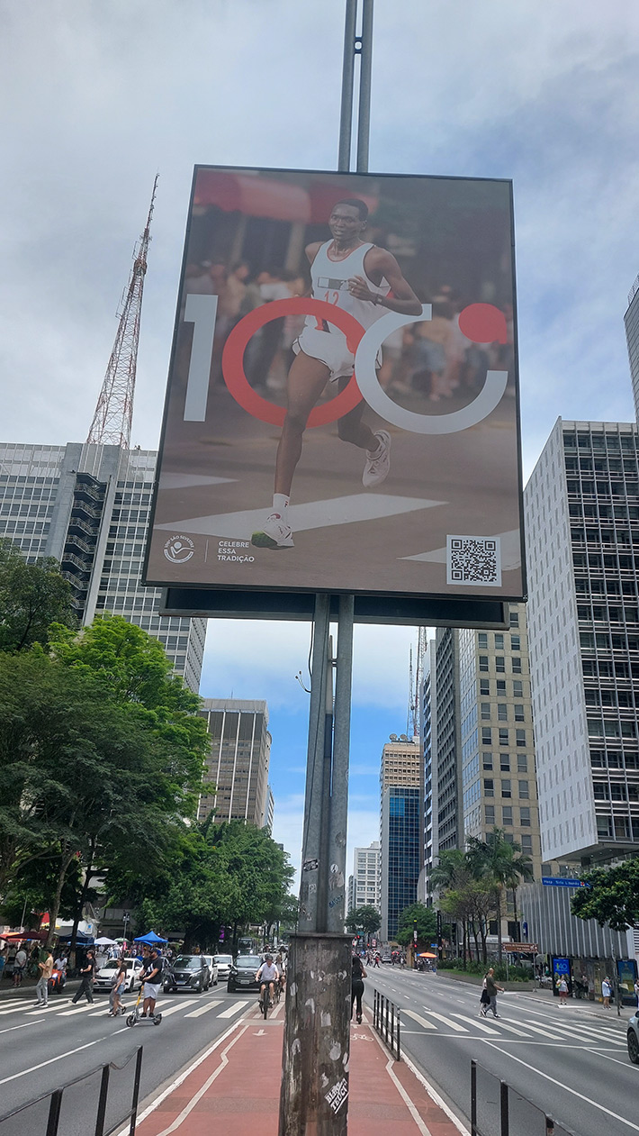 Uma imagem da medalha da centésima edição, a ser conquistada por 50 mil participantes (as inscrições já estão esgotadas) em 31 de dezembro de 2025, também está exposta na avenida Paulista.