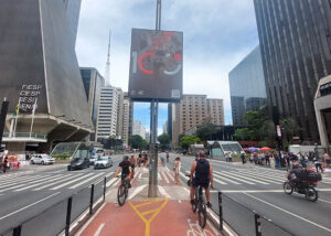 Foto da vitória do brasileiro Émerson Iser Bem, na São Silvestre-1997, exposta na Paulista (Esportividade)