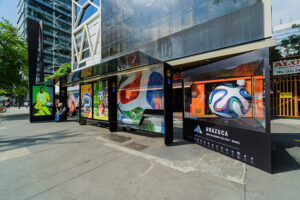 Ponto de ônibus na avenida Paulista com história de bolas da adidas das Copas do Mundo (adidas/Divulgação)